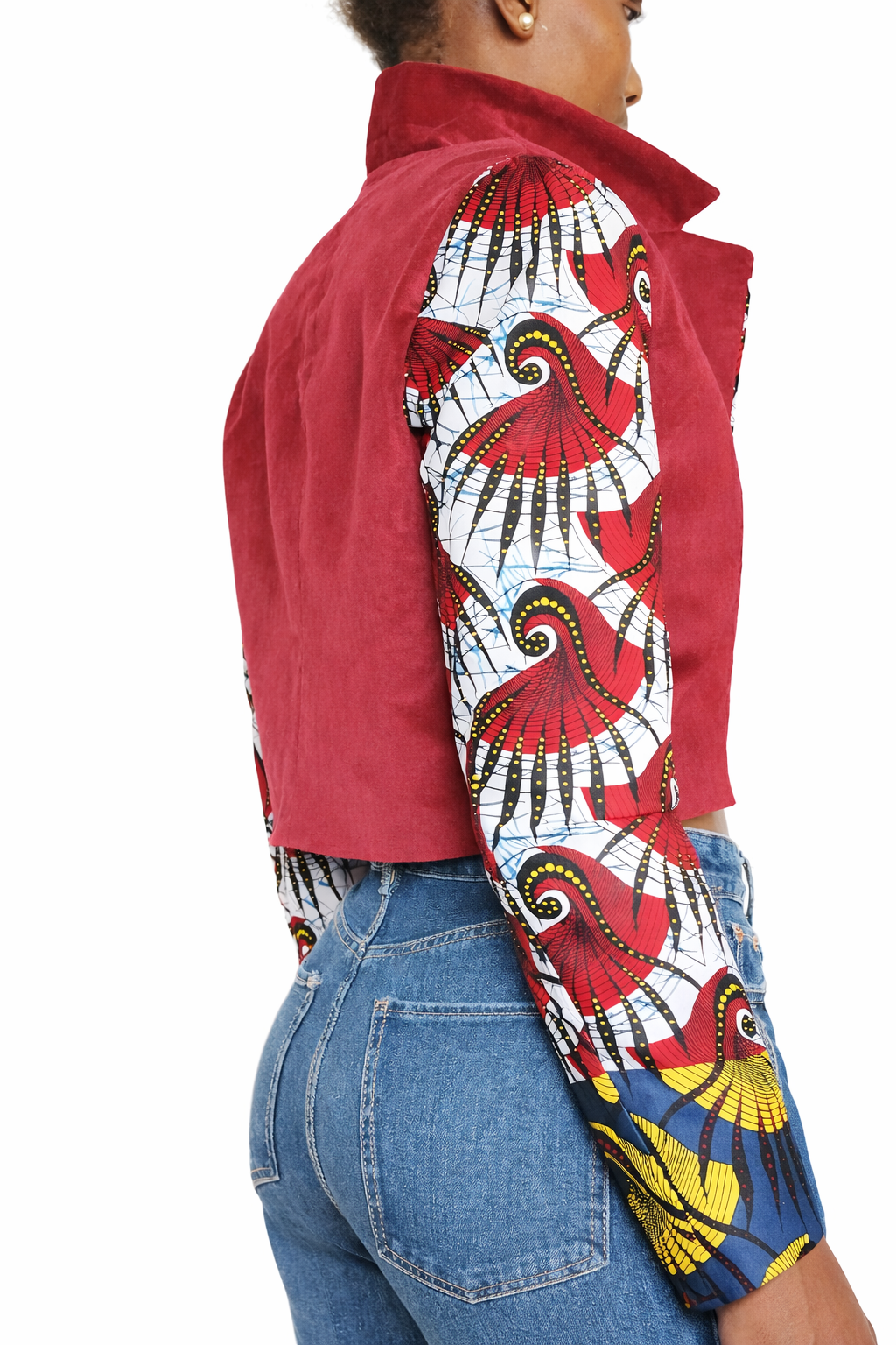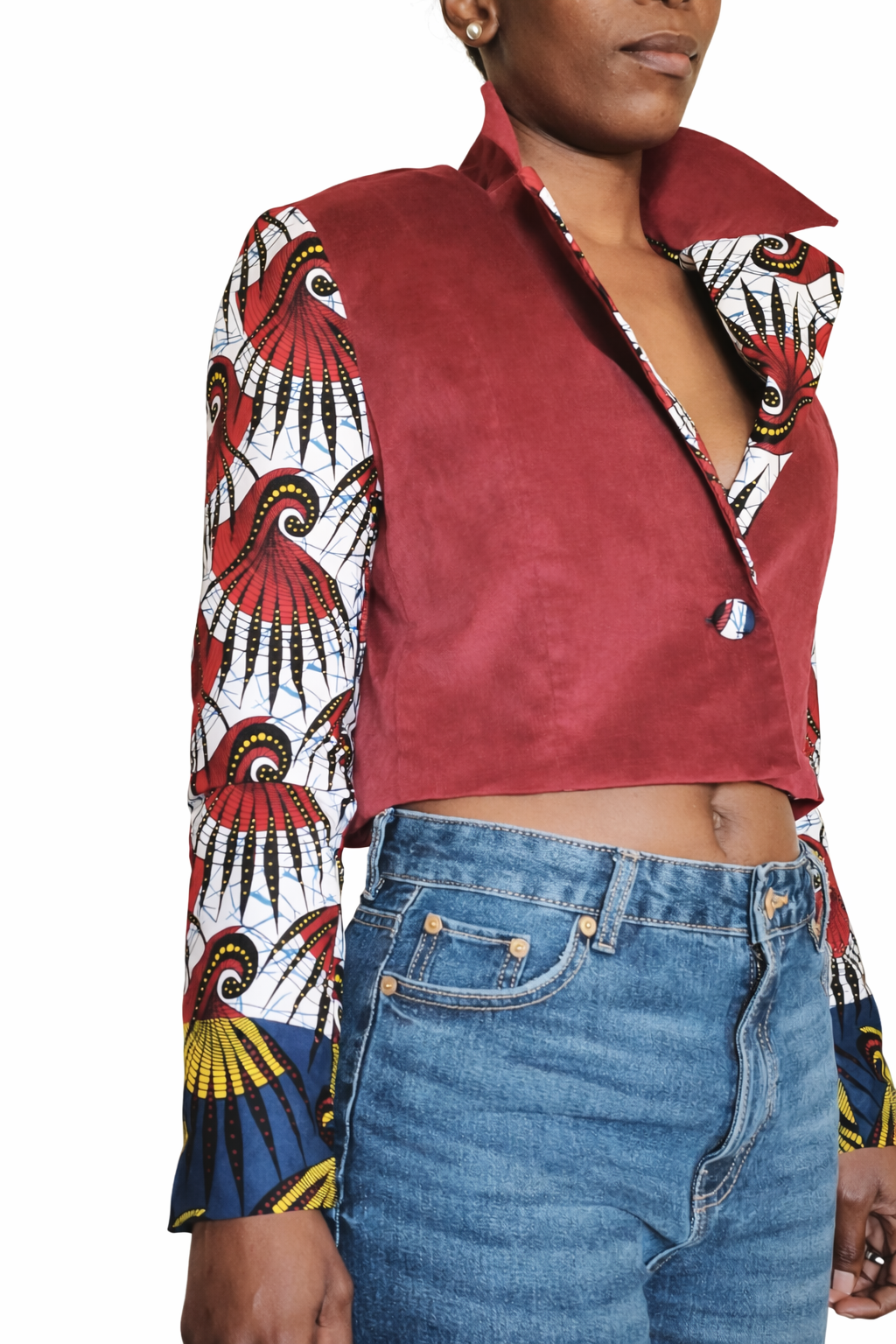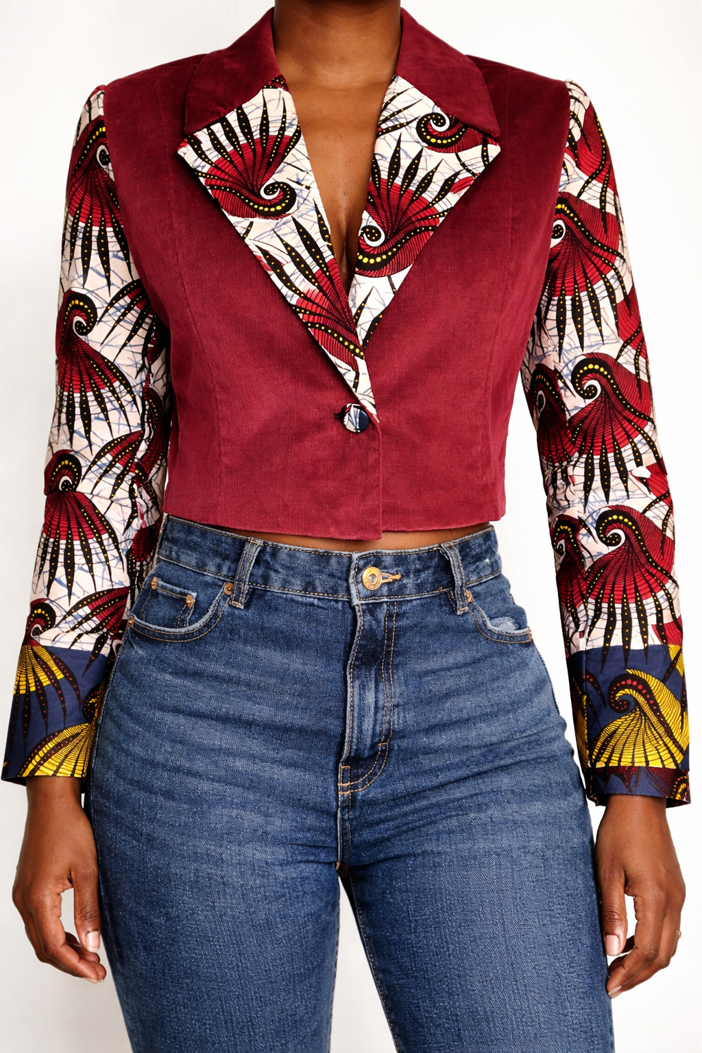 Descubra o blazer  crop, uma peça que celebra a elegância contemporânea com a riqueza da tradição africana.